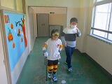 アイマスク体験では、保護者の方と手を携えて歩きました。目が見えないことの大変さを疑似体験しました。