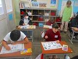 1年生生活では、「ふゆのあそび」をグループで話し合っています。なわとびや雪合戦など、どんな遊びがあるか、意見を出し合っていました。2年生図工では、描いた鬼の顔に色を塗っています。赤や青、黄色など、思い思いの色で塗っていました。